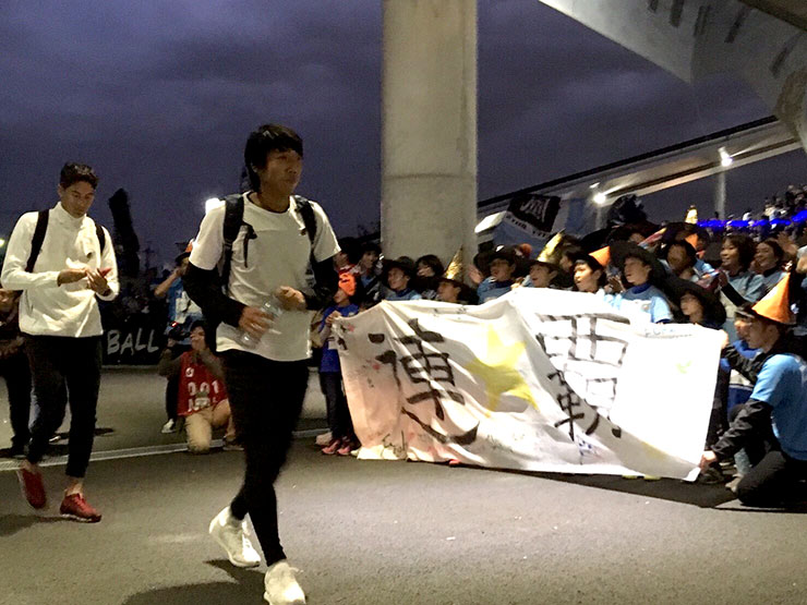 そして、フロンパークを楽しんだ後は、選手バス待ちです。昼食時に作った特製の「連覇」幕を掲げてバスを待ちます。選手を間近に見た子どもたちは「○○選手かっこいいなぁ」とか、「いいにおいがしたー!!」と素直に気持ちを言葉にしていました!