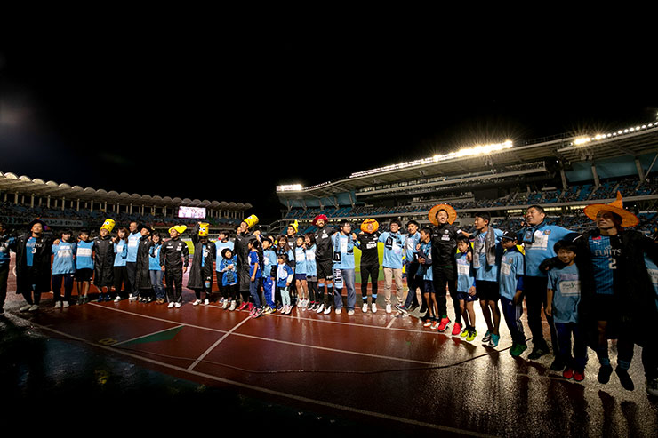 かわさき修学旅行を記念して、両チームの選手たちと記念撮影。当日に何度もリハーサルを重ねて、望んだ本番。雨が降る中でもみなさん、協力していただき、無事に撮影をすることができました。