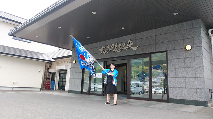 翌日になり、田植えの本番日。農業ゲームの後に皆さんにお配りしたオリジナルTシャツを参加者全員身が身にまとい、大船渡温泉を出発します! 出発の際、大船渡温泉の従業員の方がお米の豊作を願い、大漁旗を大きく振ってバスを見送ってくださいました!