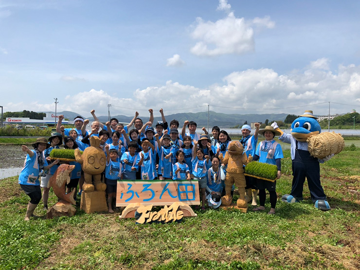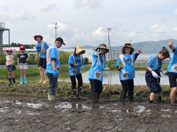 そして現地「ふろん田」に到着し、天気は最高の田植え日和!限定の特製Tシャツに身を包んだ一行は、まずは地元の方々と一緒に陸前高田市主催の田植え式に出席。