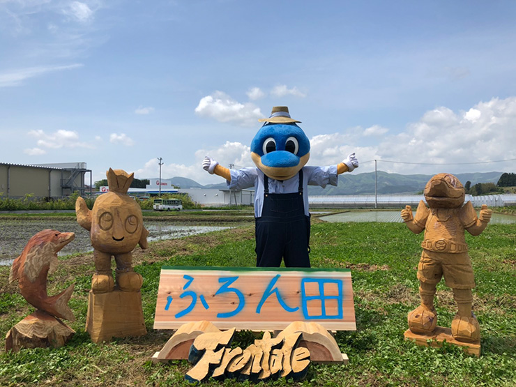 陸前高田市の子ども応援団長、マスコットキャラクターの「たかたのゆめちゃん」と一緒に、なんと農夫姿のふろん太も登場!