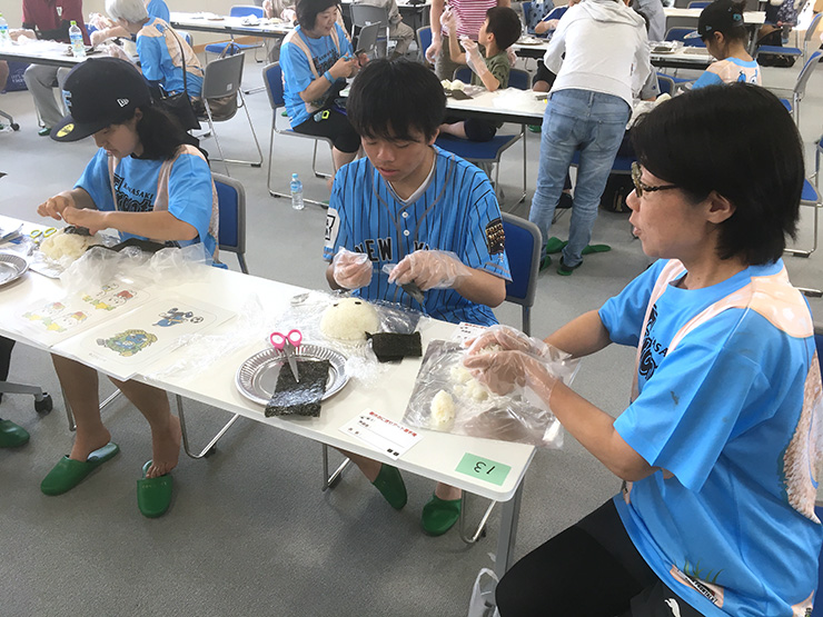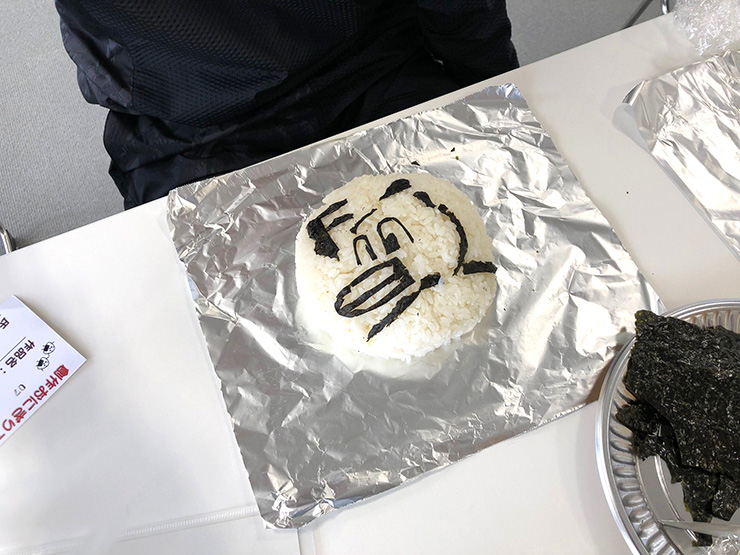 看板が完成した後は隣の営農センターへ移動し、「創作おにぎり選手権」が開催されました!「たかたのゆめ」のお米とのりを使って、ふろん太とゆめちゃんの顔をデザインするイベントだったのですが、皆さん立体にしたり可愛くデザインしたりとかなりハイレベルな闘いに!非常に盛り上がりを見せた後は、地元の皆さんが作っていただいた豚汁と一緒におにぎりをいただきました。