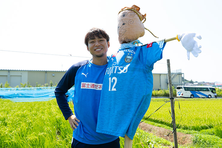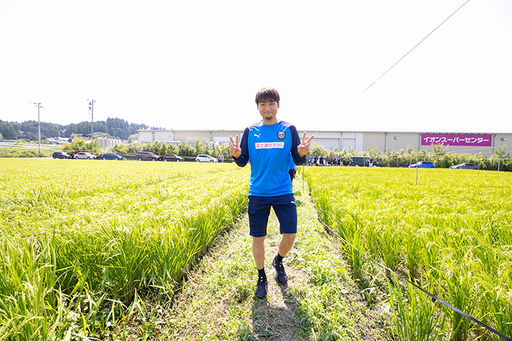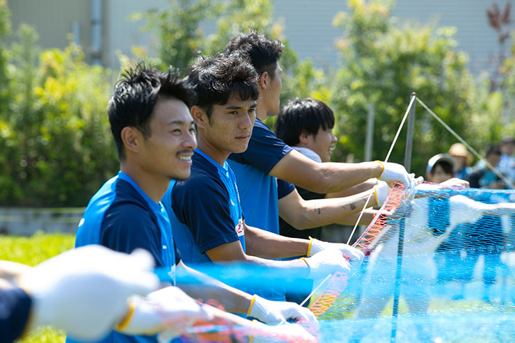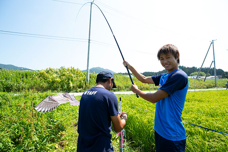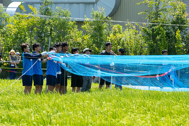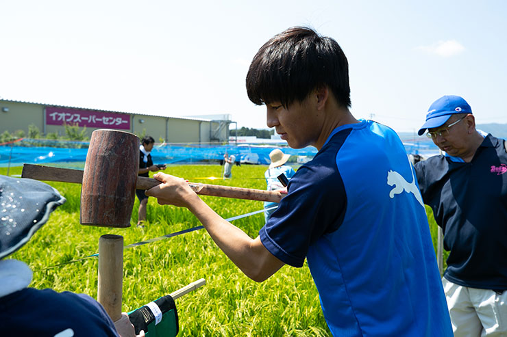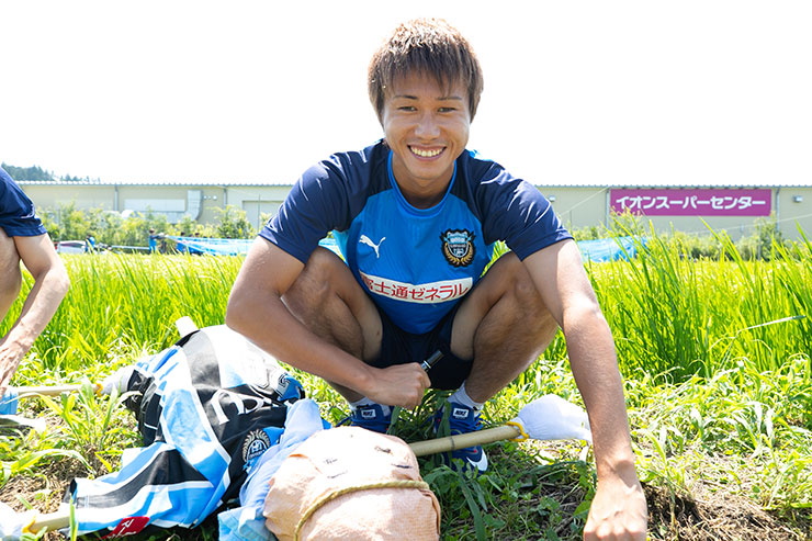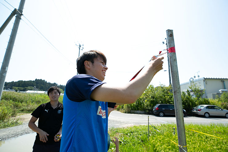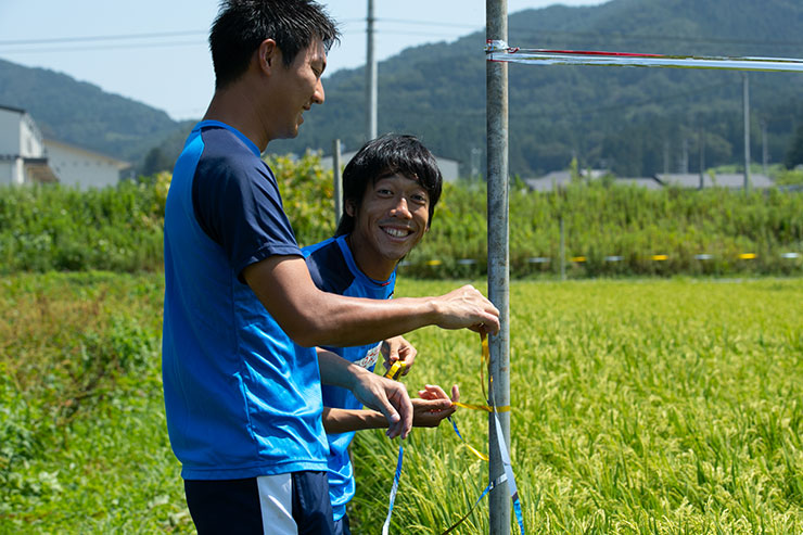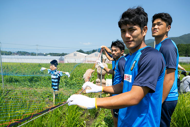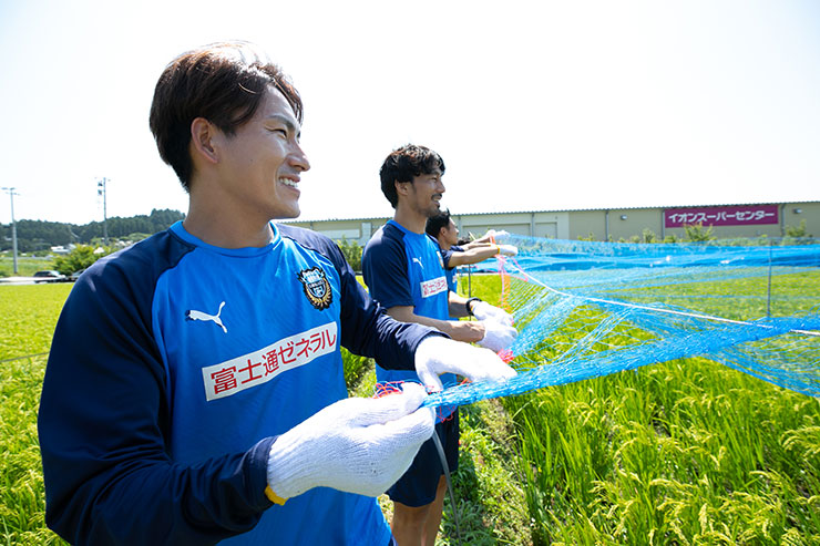 9月の収穫に向けて5月に田植えをした当初よりもしっかりと育ち、実もできはじめ、緑一面に囲まれた田んぼを見ると非常に感慨深くなりました。選手達にも事前に苗を麻生グラウンドで育ててもらい、今回はかかし作り、ネット張り、テープ張り作業を各班に分かれて活動を行いました!