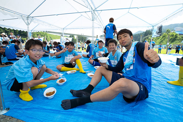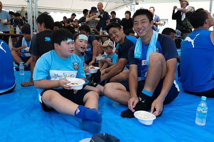 選手達と子ども達が一緒に食べて交流し、サッカーをした後のカレーはあっという間にペロリ! 大人も子ども大好きなカレーは「おかわりありますか?」と来る選手達もいるほどで、参加した子ども達以外にも保護者の方々や関係者の皆さんも合わせて用意した200人分は完食でした!