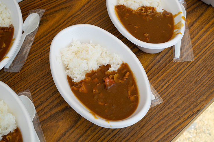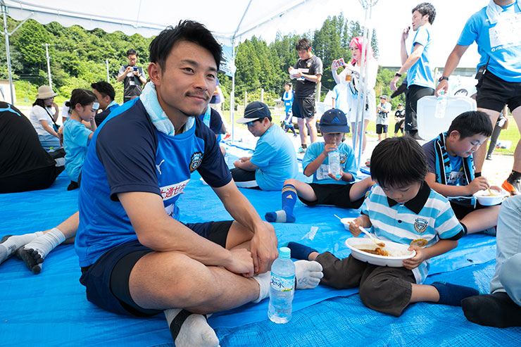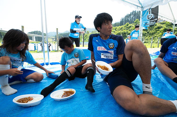 楽しくサッカー教室を終えた後は、選手と一緒にお昼ご飯!「お腹すいたー!」と言う子ども達に待っていたのは、陸前高田ランドでも毎回出店いただいている「わいわい」さんの皆さんにご協力いただいて作られた美味しいカレー!