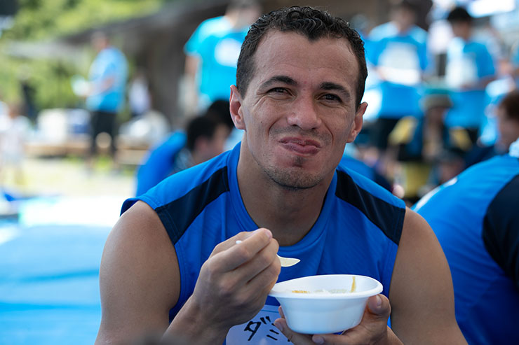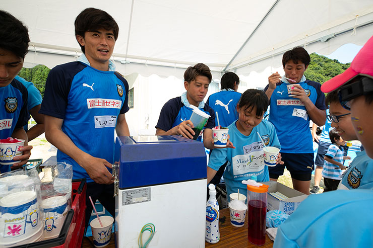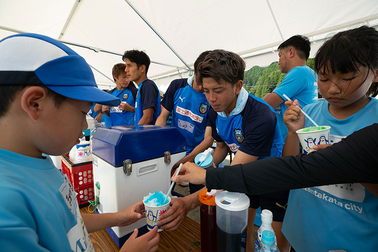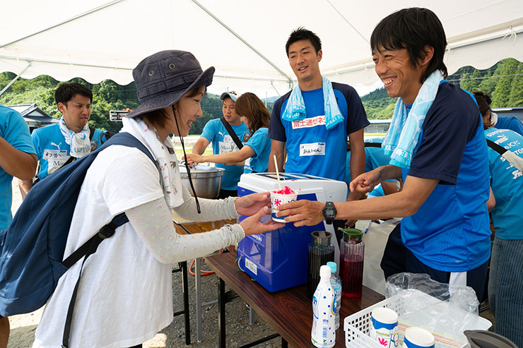 そして、カレーの後に待っていたのは夏にピッタリなかき氷! ここでは選手達がかき氷屋さんの店員になり、一つ一つ氷を入れて参加者の皆さんに渡していました。