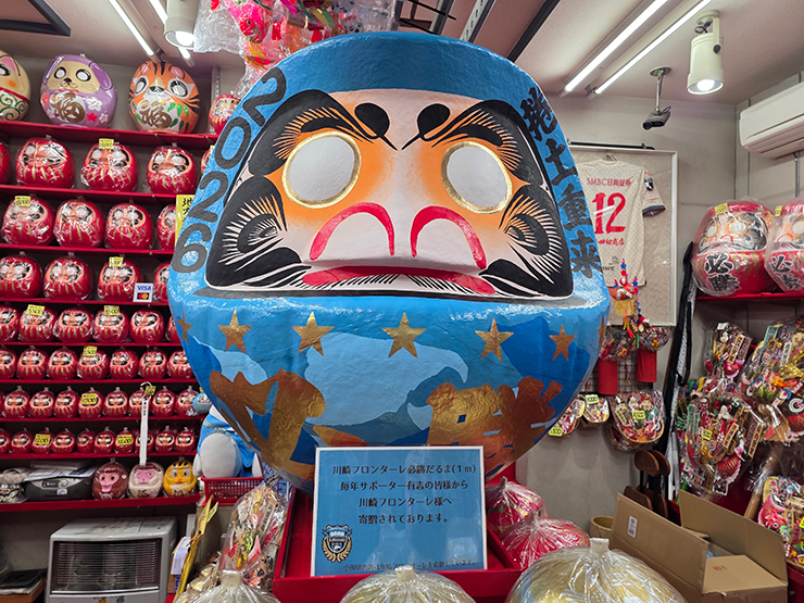 川崎大師にある小田切商店様のご協力により、ユニフォームデザインをモチーフに作成され、年末のミニだるま販売開始に合わせて小田切商店様の店頭にも展示しました。