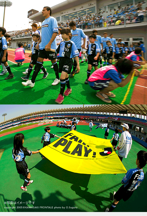 | 等々力陸上競技場で開催される川崎フロンターレ公式戦の際、両チーム選手と 手をつないで入場(22名)、フラッグを持ちピッチに入場(8名)します。 |