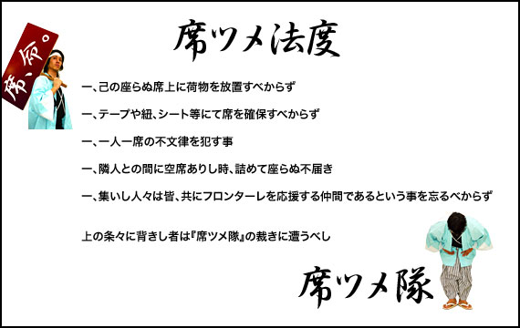 | 留意事項 | 『席ツメTime』は、一人でも多くのご来場者に、ご観戦いただける席を用意するためのものです。その趣旨をご理解下さいますようお願い申し上げますと同時に、『席ツメTime』に入る前でも、荷物を席の上に置いて他のご来場者にご迷惑をおかけすることのないようご協力をよろしくお願い致します。 |