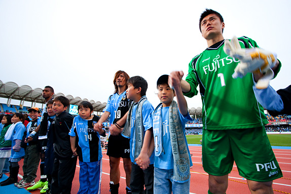 川崎フロンターレが勝利時、試合直後にピッチ横トラック上にて、選手とハイタッチし、ともに万歳三唱をします。