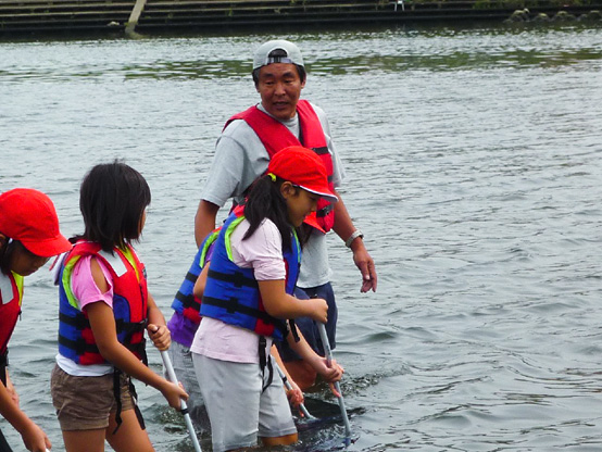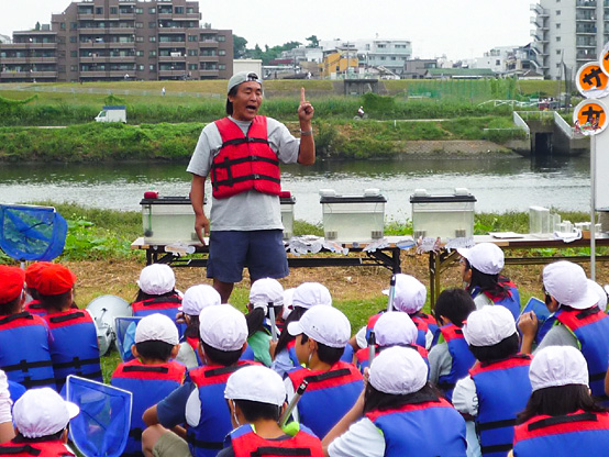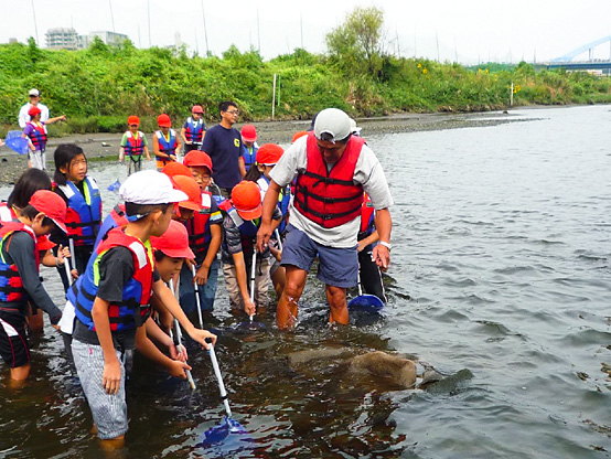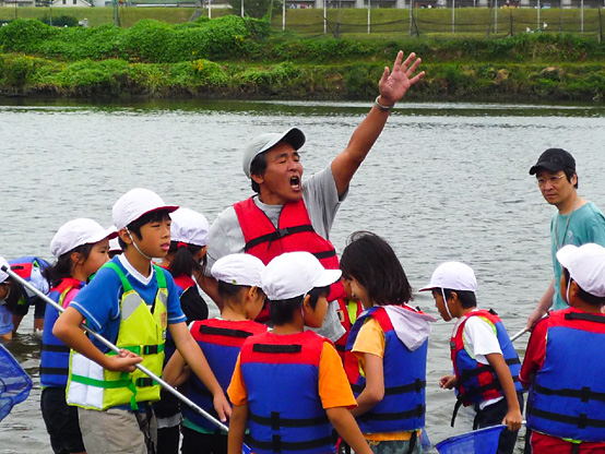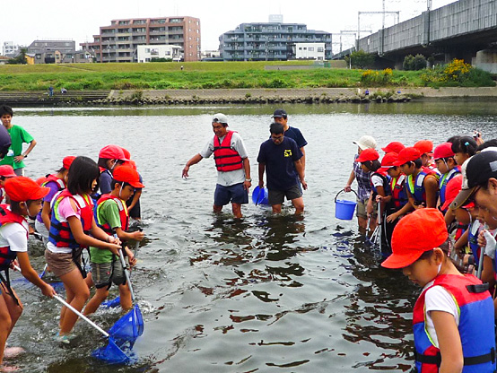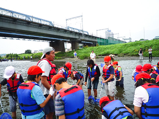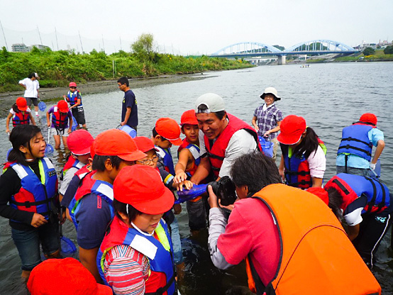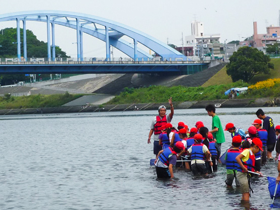 | 14:50 | がさがさ探検隊 開始 清掃の際に分けた3チームの選手に、事前申し込みで当選されたサポーターの皆さんのみが入水し、生物捕獲!! 多摩川をこよなく愛する俳優・中本賢さん指導のもと捕獲した生物種数を競争するゲームを3チーム対抗で行います!! 種類数が多いチームに賞品プレゼント。選手会提供品もあり!! |