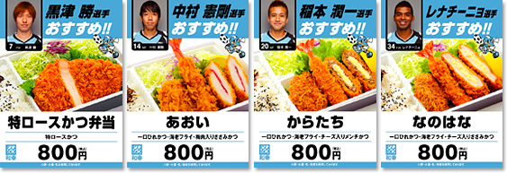 | 等々力市場にて | ◇販売場所 競技場内 バックスタンド10番ゲート付近「等々力市場」 ◇お弁当 ・クロおススメ「特ロース弁当」(80食) ・ケンゴおススメ「あおい」(80食) ・イナおススメ「からたち」(80食) ・ヘナおススメ「なのはな」(80食) |