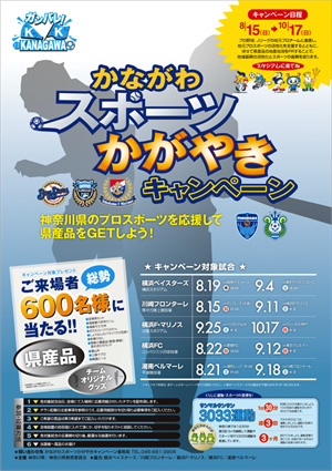 期間中の公式戦のうち、各チーム2試合、合計10試合を「かながわスポーツかがやきキャンペーン対象試合」として指定し、対象試合入場者のうち、キャンペーンに応募した方の中から、抽選で各試合60名、合計600名の方に各チームのグッズや県産品などをプレゼントします。