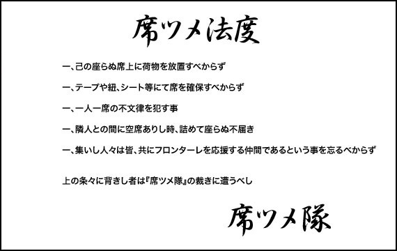 | 留意事項 | 『席ツメTime』は、一人でも多くのご来場者に、ご観戦いただける席を用意するためのものです。その趣旨をご理解下さいますようお願い申し上げますと同時に、『席ツメTime』に入る前でも、荷物を席の上に置いて他のご来場者にご迷惑をおかけすることのないようご協力をよろしくお願い致します。 |
