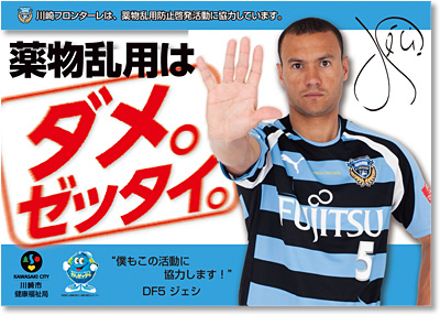 川崎フロンターレでは、川崎市健康福祉局と麻薬、覚せい剤等の薬物乱用防止を推進するため厚生労働省等が主催する「ダメ。ゼッタイ。」普及運動(6月20日〜7月19日)の期間に合わせて薬物乱用防止啓発広報等を実施しておりますが、今年度、市内で掲示する啓発用ポスターについて、DF5ジェシ選手がポスターモデルに採用されましたのでお知らせいたします。