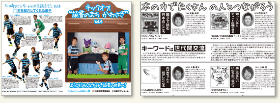 フロンターレの選手が選んだ推薦図書を掲載したリーフレット「川崎フロンターレと本を読もう!Vol.4」を市内市立図書館全館、市内小中学校、等々力陸上競技場(秋予定)等で配布・設置します。(全7万部作成)