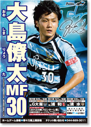2012シーズンのスケジュールポスター第4弾(大島僚太選手バージョン)の完成を記念して、オフィシャルショップ「アズーロ・ネロ」、フロンターレのフットサル場「フロンタウンさぎぬま」、武蔵小杉駅前のケンタッキーフライドチキンインレット小杉店、溝ノ口駅前のケンタッキーフライドチキン溝ノ口店、東急ハンズ川崎店、フロンターレローソンの全6店舗にて、10月6日(土)より「スケジュールポスタープレゼントキャンペーン」を実施致しますので、お知らせ致します。