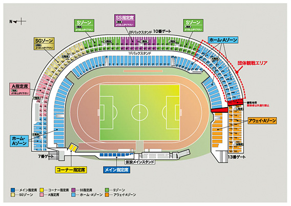 バックスタンド2階席(K階段上付近)に団体観戦エリアを設けさせていただきます。専用チケットをお持ちでない方は、団体観戦エリアにはお入りいただけません。なお、K階段上団体観戦エリアに空席がある場合には、キックオフ45分前(12時15分)以降、一般のお客様にもご案内いたします。
