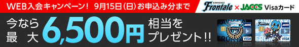 期間中にフロンターレジャックスVisaカードへご入会いただくと最大6,500円相当をプレゼント!!