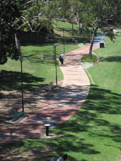 大都市シドニーの中心街から西に10数km行ったところにある街がパラマッタ。パラマッタという名は「ウナギのとれる場所」という意味の言葉に由来するという説があり、アボリジニの時代から、パラマッタ川岸に街が形成されていたそうです。パラマッタ川の河川敷にある小道の名称は「アボリジニの道」。フェリー乗降場からインフォメーションセンター付近まで続き、当時を思わせるような絵が鮮やかに描かれています。