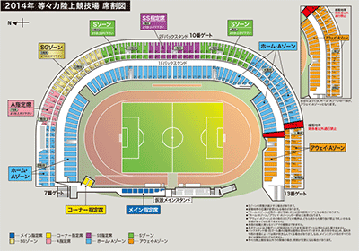 ※「SS指定席」「メイン指定席」「Sゾーン」「SGゾーン」「A指定席」「コーナー指定席」および「Aゾーン」の一部での鳴り物の使用、立ち上がっての応援、大旗振り等の応援活動は禁止されております。応援ゾーンの詳細はこちらをご確認ください。