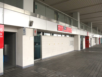 男性用、女性用ともSスタンドのコンコース及びスタンドの中通路よりスタンド下へ入ったところにあり。