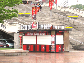 スタジアム北側場外にFCソウルグッズショップがあります。フロンターレとFCソウルのコラボタオルマフラーが販売される予定。