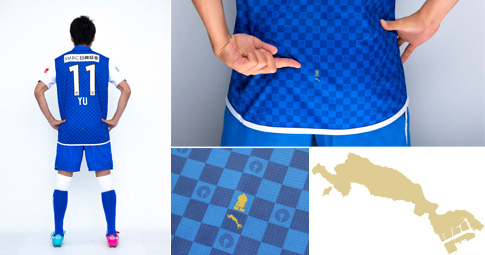 ユニフォーム全体に川崎市市章を散りばめており、背中の1か所だけ「川崎市の形」と「ふろん太」をモチーフにしたマークが入っています。