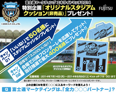 ご応募いただきクイズに正解した方の中から、抽選で50名様に「富士通マーケティング×川崎フロンターレ オリジナルスタジアムクッション(非売品)」をプレゼントいたします。当選者には厳正なる抽選のうえ、事務局よりご連絡させていただきます。※2014年8月下旬ごろ予定。
