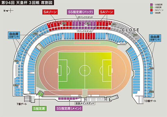 ※ホームゲーム会場でのSS指定席(メイン)[Jリーグ開催時のメイン指定席]とS指定席[Jリーグ開催時のコーナー指定席]の販売は、メインスタンド前広場のみとなります。