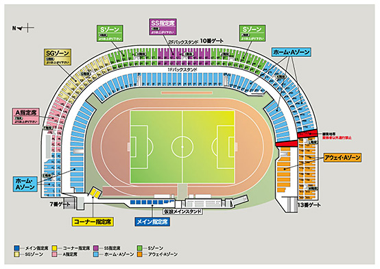 ※「SS指定席」「メイン指定席」「Sゾーン」「SGゾーン」「A指定席」「コーナー指定席」および「Aゾーン」の一部での鳴り物の使用、立ち上がっての応援、大旗振り等の応援活動は禁止されております。応援ゾーンの詳細はこちらをご確認ください。