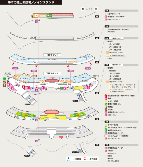 車椅子ご利用の方等のための来場者用エレベーターは「地上レベル」・「2階」・「3階(下層スタンド)」・「6階(テラスシート)」をつないでいます。