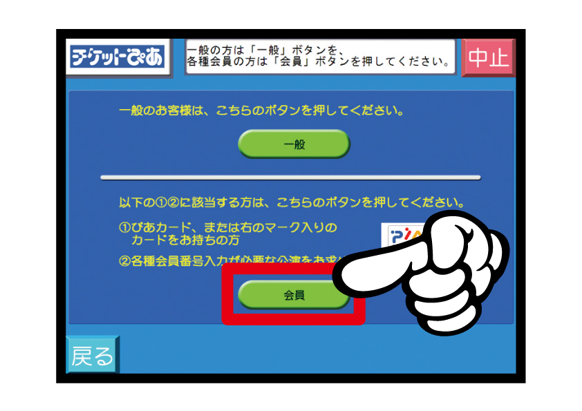 7.「一般」か「会員」かを選ぶ画面では必ず「会員」をタッチし、続けて後援会会員番号の先頭に「00」をつけた15桁を入力してください。※数字と数字の間にスペースは不要です。
