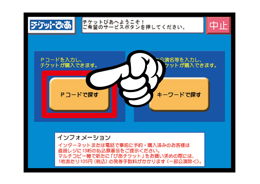 2.「マルチコピー機」トップ画面で「エンタメチケット」→「チケットぴあ」→「Pコードで探す」の順に画面タッチしていきます。