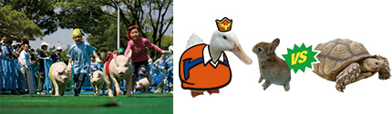 子ども4名が子ブタやアヒルと一緒にゴールを目指すコーナー。
