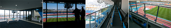 等々力陸上競技場新メインスタンドの最上階に設置されたガラス張りの6階テラスシート。試合観戦は部屋の外に設置された観客席で、地上約25mの高さからピッチを俯瞰することが可能です。また、室内にお食事をご用意いたしますので、試合前やハーフタイムはゆったりとおくつろぎいただけます。