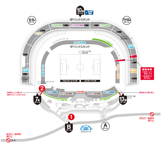 ・シーズンチケット所持者の先行入場が落ち着くまで、メインスタンドからサイド・バックスタンドへの通行はできません。詳しくはこちらをご覧ください。