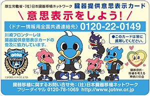 | 内容 | 臓器提供意思表示カードの普及PRブースを設置いたします。アンケートに答えるとフロンターレグッズが当たる抽選会に参加できます。