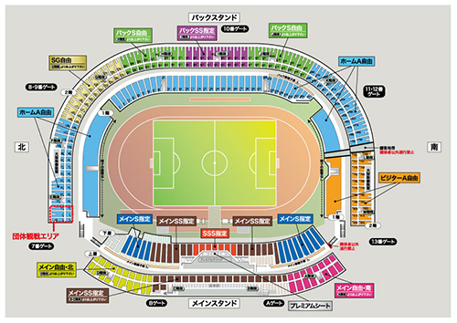 | ◇スタジアム案内図 ※現在オフィシャルサイトは更新作業中です。 場外・場内総合案内所、各ゲート、各チケット売場にてポケット観戦ガイドを配布しております。 |