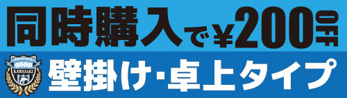 川崎フロンターレオフィシャルショップ「アズーロ・ネロ」、オフィシャルWEBショップ、等々力陸上競技場グッズ売店(メインスタンド総合案内所横、メインスタンドD階段横、バックスタンドG階段横、F階段横特設売店、場外フロンパーク内特設売店)では、キャンペーン期間中、壁掛けタイプ・卓上タイプを同時にお買い上げの場合、合計金額から200円を値引させていただきます。お得な期間にぜひお買い求めください。