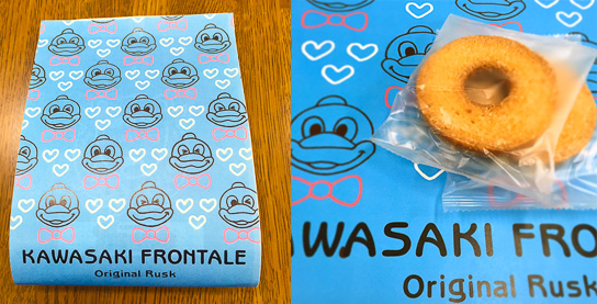 フロンターレ20周年にかけて2重(20)の輪っかになっているバウムクーヘンのラスクが2枚入っていま