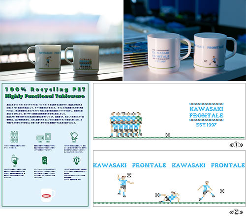 リサイクルPET材100%で作られたマグカップ。電子レンジや食洗機もOK。熱伝導率が低いために熱湯を入れてもMUG自体は熱くなり難く、耐久性も高い優れもの。デザインはクロスステッチ調でフロンターレを表現。