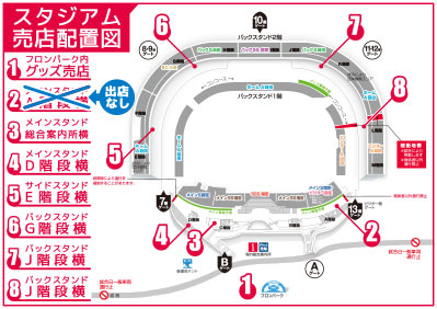 | 開園時間 | 11:30(試合開始3時間30分前〜)〜15:00 ※アトラクションはキックオフ30分前まで ※フロンパークを開催するにあたり、競技場各入場ゲートにてスタンプによる再入場対応あり。 (キックオフ30分前まで) ※入場ゲート、コンコースの状況により、その他の動線をご案内する可能性がございます。 |