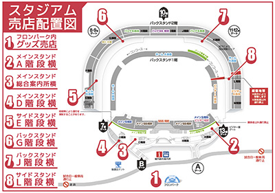 ※「⑧ビジターゴール裏(L階段左)」にも売り場はありますが、フロンターレグッズの取り扱いはございません。