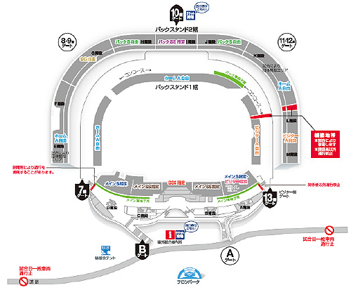※全ゲートにて、手荷物検査を実施いたしますので、お早めにご来場ください。 ※メインスタンドコンコースの通行については、キックオフ30分前から試合終了まで(ハーフタイムを除く)チケットチェックを行い、メインスタンドのチケットをお持ちの方のみご通行可能とします。 |