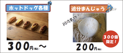 | 飲食⑧ | ◆かわさき応援バナナのチョコバナナ![]() ◇かわさき応援バナナのチョコバナナ:200円 ※クジで当たりが出るともう1本「ホワイト」チョコバナナをプレゼント ※かわさき応援バナナの売上の一部は、「等々力陸上競技場改築の費用」として川崎市へ寄付いたします |