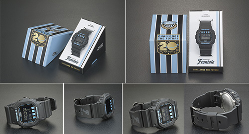 G-SHOCKの原点とも言える伝統のスクエアデザインがお馴染みの5600モデルをベースに、クラブ創立時かつ今シーズンのユニフォームデザインを取り入れ、フロンターレカラーのブルーとブラックでまとめました。また、クラブロゴをベルト部分に、裏蓋に20周年ロゴ記念ロゴを施したスペシャルデザインとなっています。また、本体が入っているボックスもフロンターレオリジナルデザインとなっており、細部にまでこだわった仕上がりです。