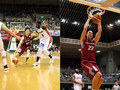 日本代表のスリーポイントシューター辻直人選手(写真左)や元NBAプレーヤーで2m10cmのニック・ファジーカス選手(写真右)を中心に、Bリーグ初代王者を狙う。