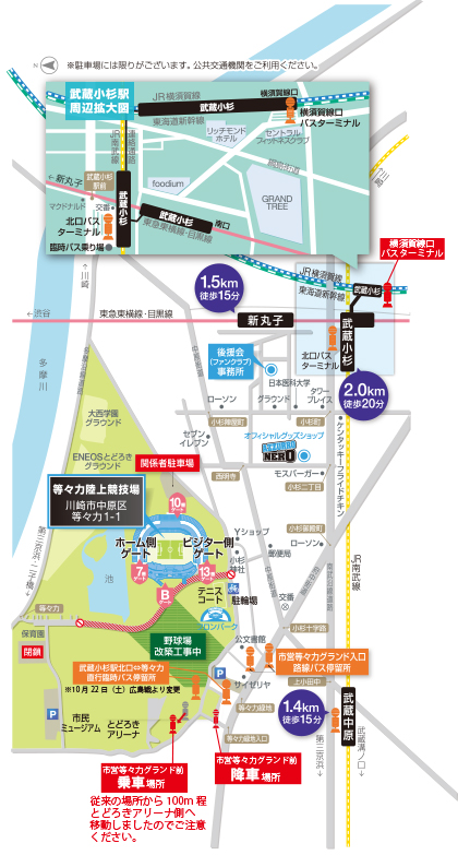 等々力緑地正面広場の整備に伴い、お帰りの際の乗車場所となる「市営等々力グランド前」のバス停が、100mほど移動しております。JR武蔵小杉駅横須賀線口発の乗車場所及び、等々力グランド前の降車場所の変更はございません。