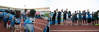 川崎フロンターレが勝利時、試合直後にピッチ横トラック上にて、選手とハイタッチをし、共に万歳三唱をします。